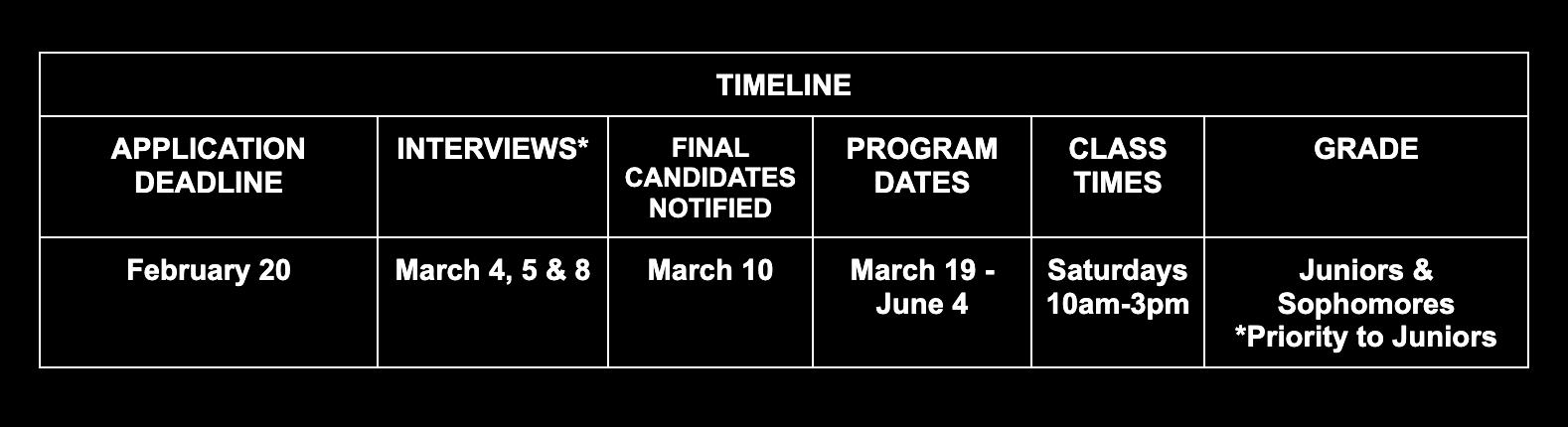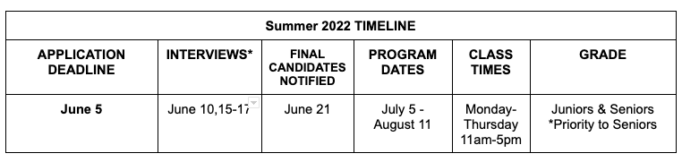 Eligibility: High School Juniors and Sophomores; Juniors will exist given priority. Teens do not need to alive in Queens; all students living in the Greater NYC expanse are eligible and encouraged to apply.